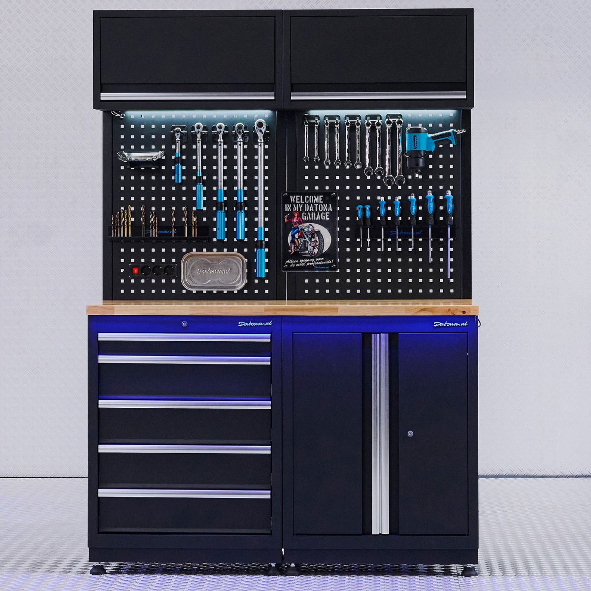 L’ensemble de cet aménagement premium est doté d’un revêtement en poudre résistant aux rayures et aux chocs. Si vous avez besoin de plus d’espace de travail ou de rangement à l’avenir, vous pouvez facilement compléter votre installation avec d’autres modules premium Datona. La majorité des éléments est livrée préassemblée, vous permettant de commencer rapidement.