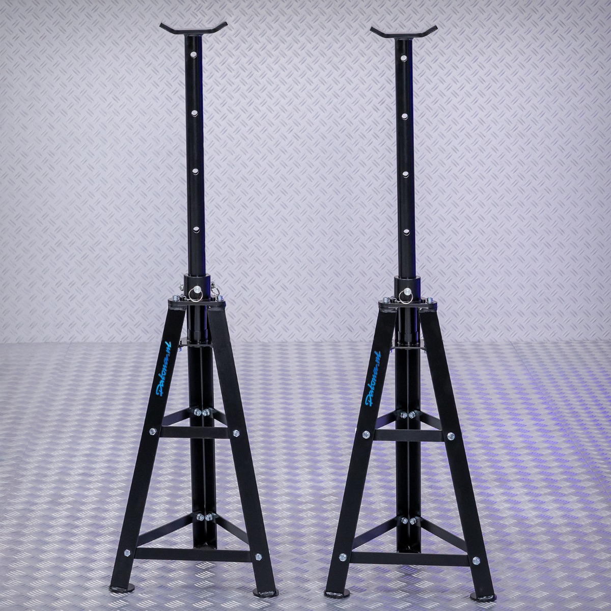 Ces chandelles sont réglables en hauteur de 120 à 190 cm. La hauteur de travail maximale de 1,90 mètre correspond parfaitement à la hauteur de levage de nombreux ponts élévateurs à ciseaux, permettant à la plupart des utilisateurs de se tenir debout sous le véhicule sans se pencher. Cela garantit une posture de travail ergonomique et limite la fatigue.