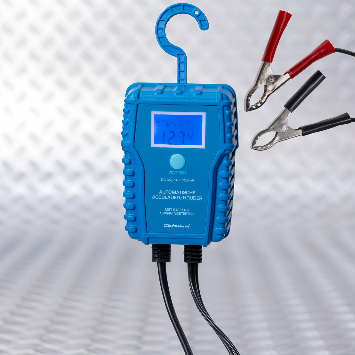 Ce chargeur de batterie automatique peut aussi être utilisé comme chargeur d’entretien et testeur de batterie pour les batteries au plomb 6 V et 12 V. Le chargeur détecte automatiquement si la batterie connectée est une 6 V ou une 12 V, choisit la tension de charge adéquate et charge avec un courant de 750 mA. L’écran LCD affiche la tension de la batterie et le niveau de charge en pourcentage, avec un symbole clair. Un témoin LED indique quelle tension est active et en cas de défaut un symbole d’erreur se met à clignoter.