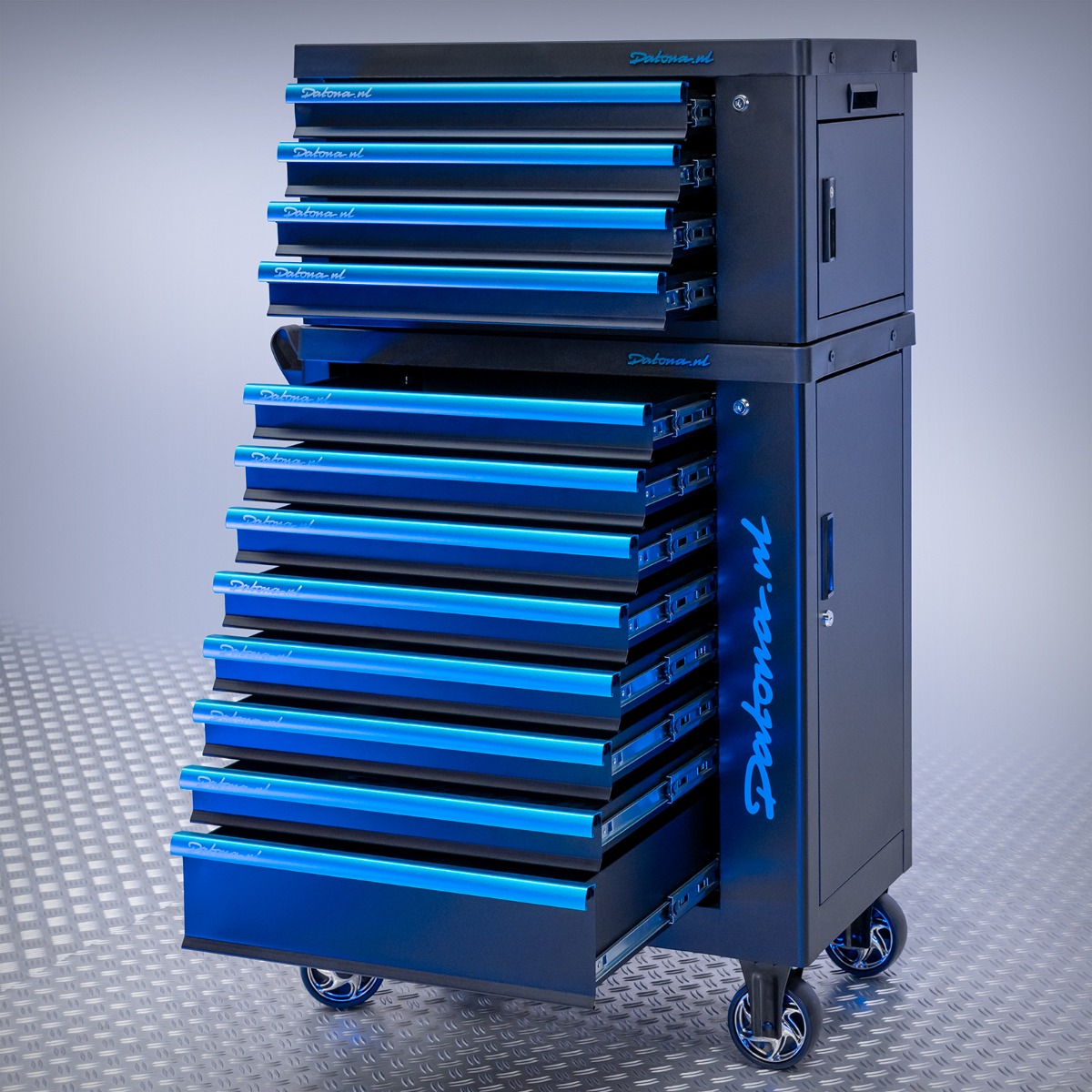 Voici une solution de stockage pratique : un chariot à outils robuste et spacieux, accompagné d'une caisse supérieure de Datona. Cette combinaison offre un espace de rangement idéal et sécurisé pour tous vos outils. Son revêtement en poudre noir mat, résistant aux rayures, combiné aux bandes bleues éclatantes sur la face avant de chaque tiroir, donne à ce chariot à outils un look moderne et chic. Livré sans outils, ce qui est très pratique pour les bricoleurs ou les professionnels ayant déjà une collection d'outils. Vous pouvez également équiper ce chariot avec les sets d’outils et les modules Datona.
