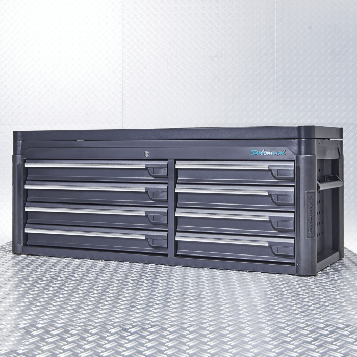 Les 8 grands tiroirs à roulement à billes sont très solides avec une capacité de charge maximale de 40 kg par tiroir. Les tapis souples empêchent des rayures sur la peinture et les outils. De cette façon, vous gardez toujours la boîte bien rangée. Vous pouvez ouvrir complètement les tiroirs afin de voir ce qu'il y a dans le tiroir jusqu'à l'arrière. Cela signifie que vous n'avez pas à chercher inutilement cette clé ou cette pince. Les 8 tiroirs solides sont joliment répartis sur les côtés gauche et droit du coffre. Dès qu'un tiroir est ouvert, les autres tiroirs se verrouillent pour plus de sécurité.