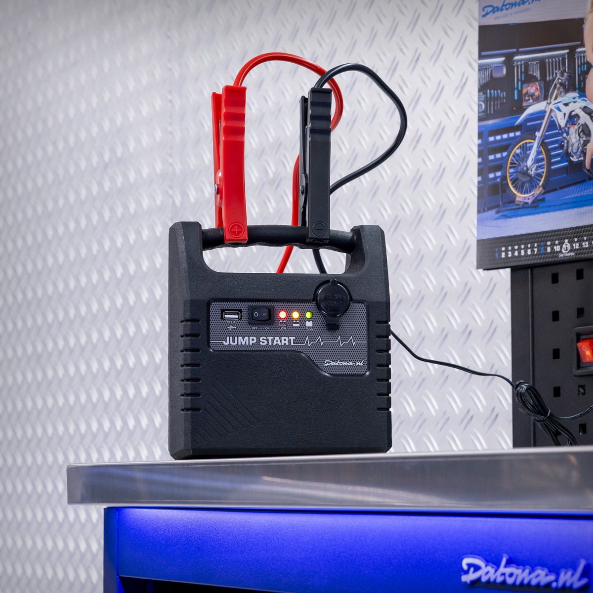 En plus d’être un booster de démarrage, le démarreur Datona fait également office de powerbank pratique. Grâce à la sortie USB 5 V 2,1 A, vous rechargez facilement votre téléphone, tablette ou tout autre appareil USB, et via la prise DC 12 V vous pouvez brancher des accessoires 12 V. Vous rechargez le booster lui-même avec l’adaptateur secteur 230 V fourni ou via la prise allume-cigare 12 V de la voiture. Pour des performances optimales, rechargez le booster toutes les 30 jours et, après chaque utilisation, laissez-le charger toute une nuit afin qu’il soit toujours prêt pour la prochaine fois.