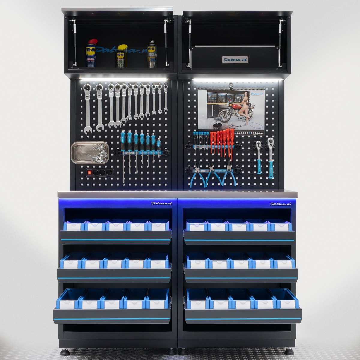 Le meuble mural de cet aménagement est extra large et équipé de deux puissants vérins à gaz. Il s’ouvre et se ferme facilement, et le rabat reste bien ouvert pendant l’utilisation. Parfait pour y ranger vos bombes aérosols, boîtes ou gros outils à main comme une clé dynamométrique ou un levier. Grâce à sa grande capacité de rangement, le plan de travail reste dégagé, ce qui rend le travail plus efficace et organisé.