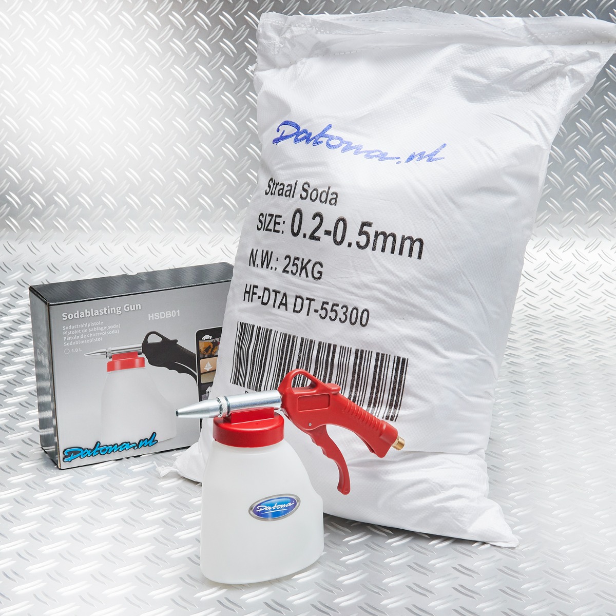 Pour nettoyer le chrome, l’aluminium et d’autres matériaux délicats, choisissez le sablage à la soda. Ce set combine l’abrasif soda Datona avec un pistolet de sablage à la soda spécial, afin que vous puissiez commencer immédiatement votre projet de sablage. Les grains fins de soda éliminent la graisse, la saleté, la peinture et une légère oxydation sans endommager la surface. Ce set est donc parfait pour rafraîchir des baguettes chromées de tracteurs, des pièces de moto, des jantes en aluminium ou des carburateurs.