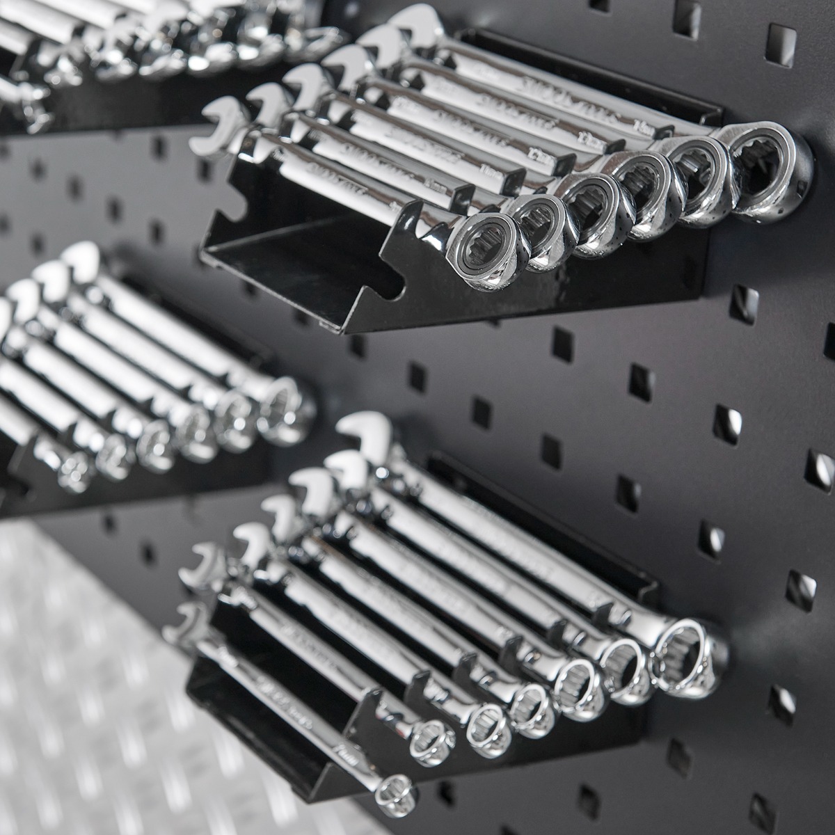 Chaque support de rangement pour clés plates peut accueillir 7 clés, permettant ainsi de ranger jusqu'à 28 outils au total. De plus, les fentes de 8 mm peuvent également accueillir d'autres outils, tels que des clés en T.