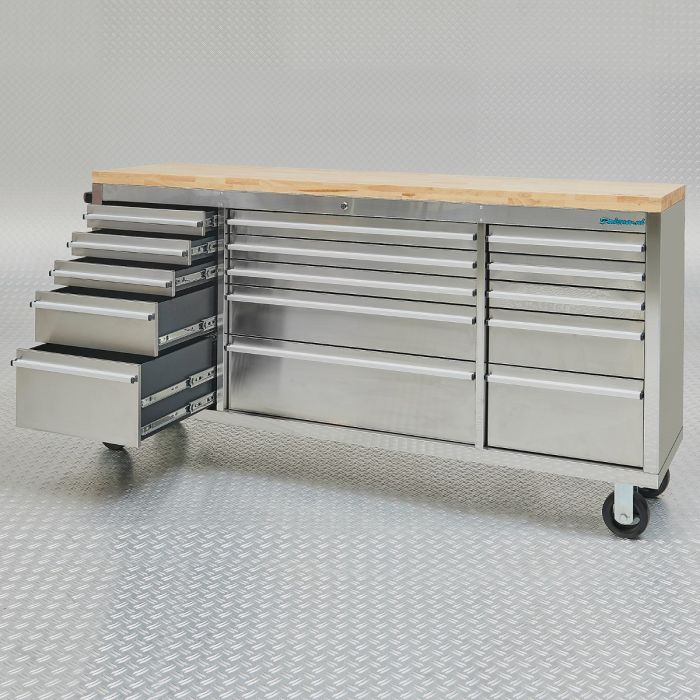 L'établi multifonctionnel est également équipé d'une poignée pratique que vous pouvez monter à votre guise (à droite ou à gauche). Les tiroirs sont 100 % extensibles et peuvent être disposés comme vous le souhaitez. L'établi en acier inoxydable peut être verrouillé entièrement ou partiellement à l'aide de deux serrures à cylindre. Cet établi de haute qualité présente un design attrayant et est doté de toutes les caractéristiques industrielles.