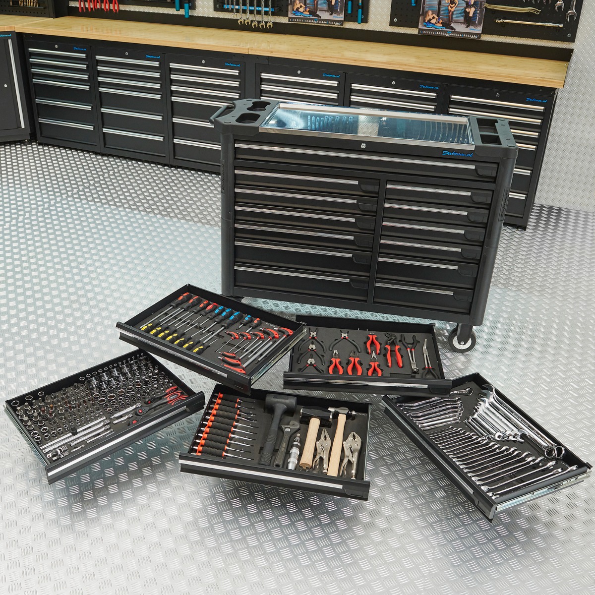 La servante est livrée avec 5 jeux d’outils Smoos. Vous choisissez librement dans quels 5 tiroirs (sur 13) vous placez les modules. Comme chaque jeu est intégré dans un module en mousse, vous installez chaque set en un instant et vous gardez des tiroirs nets et organisés. Nous recommandons d’utiliser les tiroirs peu profonds pour les sets fournis, et de réserver les tiroirs profonds et le tiroir extra large à vos outils, pièces ou équipements personnels. Les outils Smoos, soigneusement finis et conçus pour un usage intensif, offrent un grand confort d’utilisation. La variété des contenus permet de couvrir un large panel de travaux. Jeux inclus :