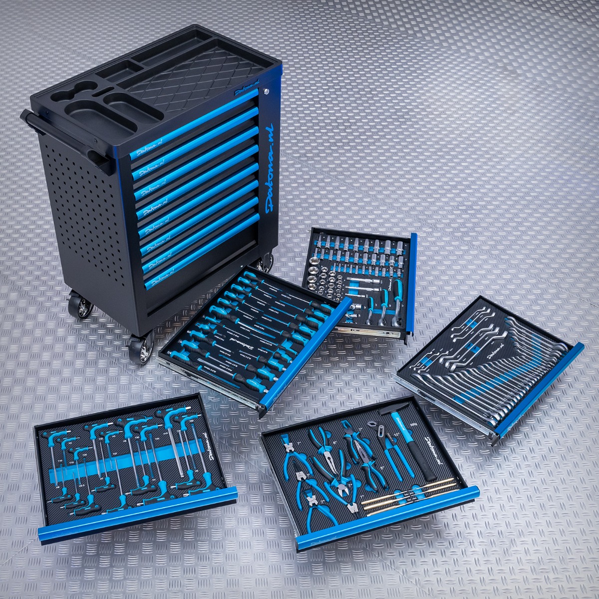 Cette servante d’atelier équipée offre 8 tiroirs spacieux, dont 5 déjà équipés d’outillage de qualité dans des inserts mousse. Les coulisses à billes assurent une utilisation fluide, adaptée à un usage intensif au quotidien.