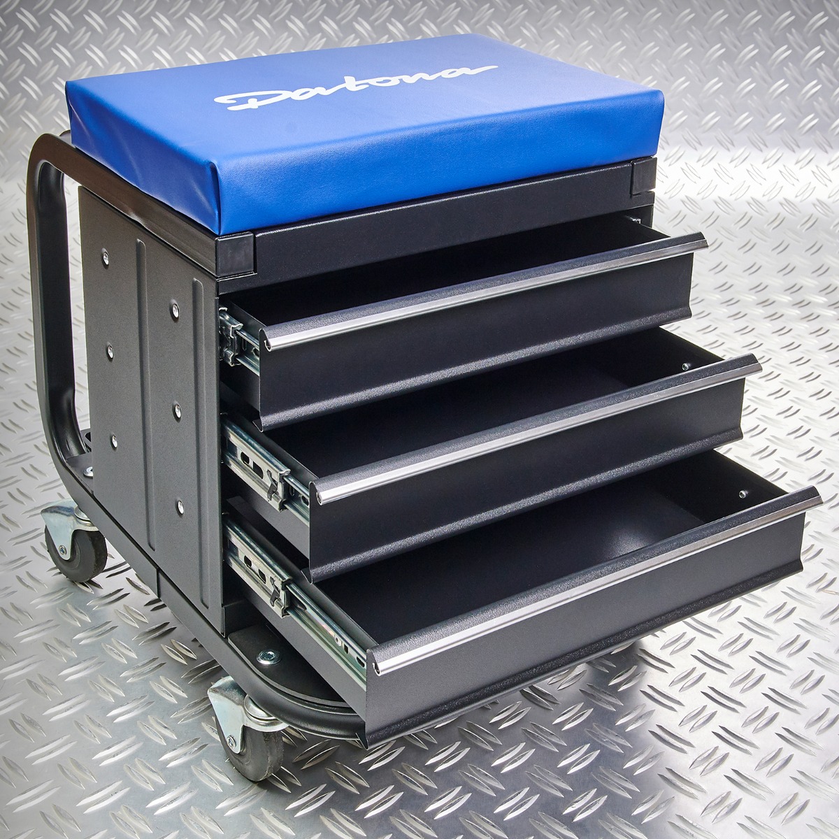 En plus du confort, ce tabouret d'atelier offre également un espace pour ranger les outils. Vous pouvez parcourir tout votre atelier en toute simplicité et sans revenir constamment sur vos pas pour attraper d'autres outils. Emmenez directement avec vous tout ce dont vous avez besoin, vous outils vous suivent autour du véhicule, et en toute sécurité ! Les roues robustes mesurent 6cm de haut et roulent facilement. Le tabouret d'atelier mesure 36,5cm de haut et a un siège large de 37,5cm. Le coussin de 5cm d'épaisseur garantit que vous soyez toujours à l'aise. Vous trouverez directement sous le siège un tiroir qui mesure 28,5 x 18,5 x 4cm et qui est idéal pour ranger des tournevis et autres petits outils. Le plateau compartimenté qui se trouve plus bas entre les pieds du tabouret vous permet d'y mettre de plus gros outils, par exemple une clé dynamométrique ou un outils pneumatique.